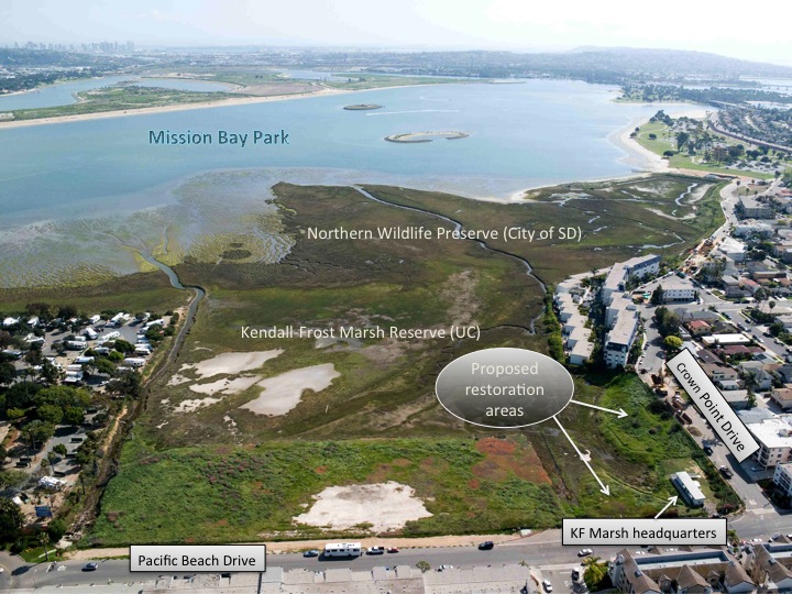 Aerial view of Kendall-Frost Marsh Reserve (owned by UC), Northern Wildlife Preserve (owned by the City of San Diego) and proposed transition zone restoration areas. The total project area is approximately 2 acres but the area that gets modified significantly is approximately 1 acre.